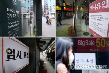 12일 서울 중구 명동 거리의 상점 입구에 임시휴업 안내문이 부착돼 있다. 코로나19 영향에 세계보건기구(WHO)의 팬데믹 선언까지 이어지며 소상공인과 자영업자들이 직격탄을 맞고 실물 경기의 한파가 이어지고 있다. (사진=연합뉴스)