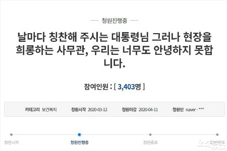 지난 12일 청와대 국민청원 게시판에는 '날마다 칭찬해 주시는 대통령님 그러나 현장을 희롱하는 사무관, 우리는 너무도 안녕하지 못합니다'라는 제목의 청원글이 등장했다.