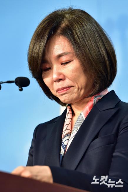미래통합당 인천 연수을 공천이 확정됐으나 공관위의 번복으로 민경욱 의원과 경선을 하게 된 민현주 전 의원이 13일 오전 국회에서 관련 기자회견을 하며 울먹이고 있다.