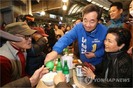 더불어민주당 후보로 4.15 총선 종로에 출마하는 이낙연 전 국무총리가 2월 15일 오후 서울 종로구 광장시장 빈대떡 가게를 찾아 시민들에게 막걸리를 따라주고 있다. 2020.2.15 (사진=연합뉴스 제공)