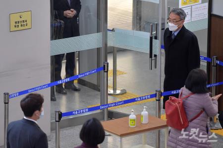 '사법행정권 남용 의혹' 임종헌(61) 전 법원행정처 차장이 16일 보석 뒤 첫 재판에 출석하기 위해 서울 서초구 서울중앙지법에 들어서고 있다.