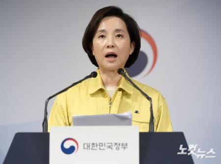 유은혜 사회부총리 겸 교육부 장관이 17일 오후 서울 종로구 정부서울청사에서 개학 연기 관련 브리핑을 하고 있다. 유 부총리는 코로나19 확산을 방지하기 위해 전국 학교의 개학일을 당초 3월 23일에서 4월 6일로 2주간 연기한다고 발표했다.