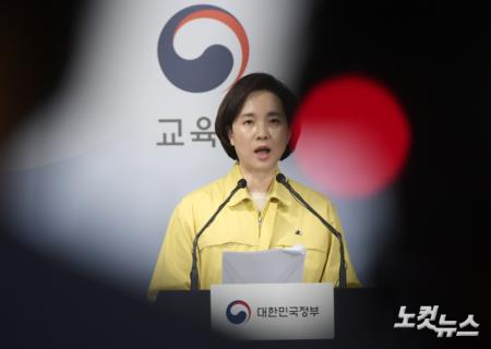 유은혜 사회부총리 겸 교육부 장관이 17일 오후 서울 종로구 정부서울청사에서 개학 연기 관련 브리핑을 하고 있다. 유 부총리는 코로나19 확산을 방지하기 위해 전국 학교의 개학일을 당초 3월 23일에서 4월 6일로 2주간 연기한다고 발표했다.