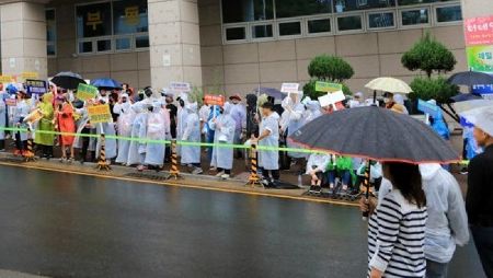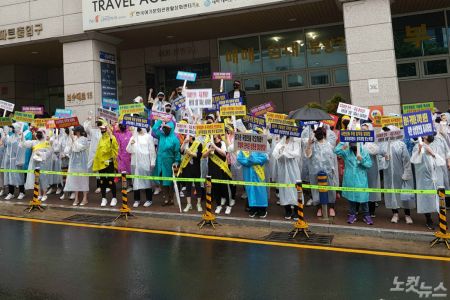 지난해 10월 부산 서구청 앞에서 완월동 성매매 여성들이 생존권 보장 집회를 열고 있다. (사진=박진홍 기자)