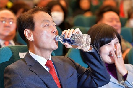 5일 오후 여의도 국회도서관에서 열린 미래한국당 중앙당 창당대회에서 한선교 신임 대표가 물을 마시고 있다. 박종민기자