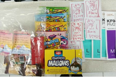 봉투 안에는 KF94 마스크 5매, 코로나 예방 부적, 간식과 정성스럽게 작성한 손편지가 들어 있었다.