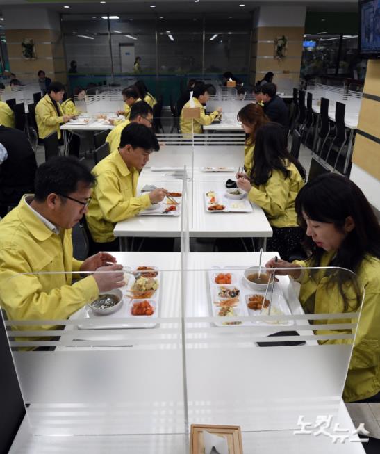정부가 코로나19 확산 예방을 위해 2주간 단기간 고강도 ‘사회적 거리두기’를 전개한 가운데 23일 서울 성동구청 직원들이 유리 가림막이 설치된 구내식당에서 식사를 하고 있다.