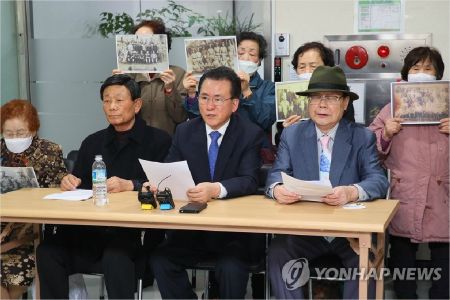 강제징용피해자를 위해 활동해 온 '가자!평화인권당'의 최용상 비례대표 후보(앞줄 왼쪽 세번째) 등이 23일 서울 여의도 더불어시민당사 로비에서 시민당의 비례대표 후보 배제 결정에 반발하며 항의 기자회견하고 있다. (사진=연합뉴스)