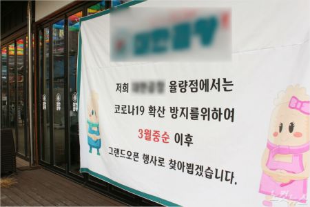 충북 청주시 율량동의 한 음식점 앞에 코로나19 사태로 개업을 연기한다는 현수막이 붙어 있다. (사진=최범규 기자)