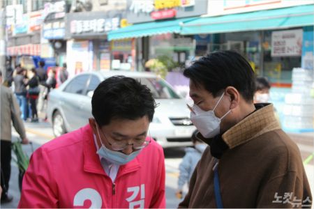 이를 잘 알고 있는 윤 후보는 정부의 신속하면서도 공정한 정부의 피해 지원을 촉구하고 있는 반면 김 의원은 "지역 주민의 걱정들이 많으시다"면서도 매번 손세정제를 발라가면서까지 주민들과 사람들과 하나하나 악수를 나누며 자신을 소개했다.