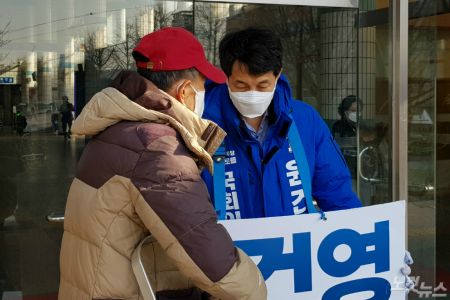 25일 구일역 앞에서 지역구 주민의 말을 경청하고 있는 더불어민주당 윤건영 후보(오른쪽). (사진=박광주 인턴기자)