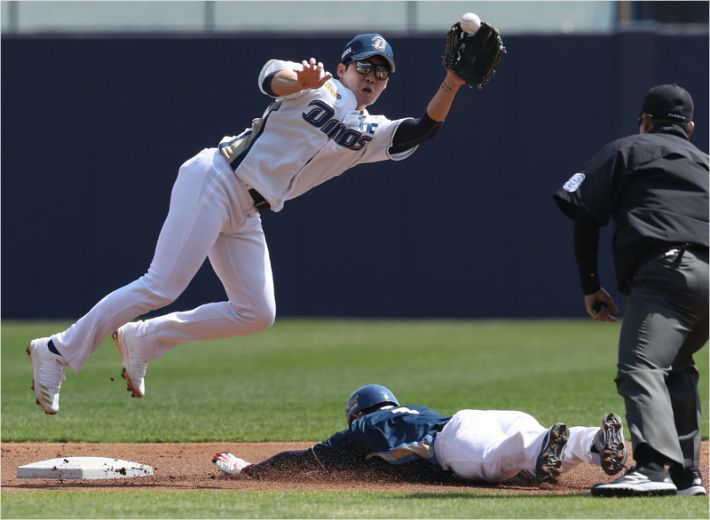 25일 경남 창원NC파크에서 열린 NC다이노스 청백전에서 1회초 1사후 볼넷으로 진루한 청팀 김준완이 2루 도루를 시도해 성공하고 있다. (사진=연합뉴스)