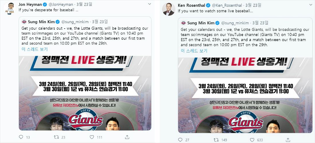 그는 "KBO 리그는 코로나19로 인해 리그가 연기됐지만 곧 재개할 수 있게 시스템을 개선하고 있다"면서 "코로나19를 잘 다루는 한국은 메이저리그 팬들에게 희망의 느낌을 줄 것이다"고 설명했다.