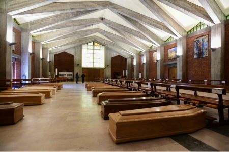 이탈리아 북부 베르가모 인근의 소도시 세리아테의 한 가톨릭 교회 본당 내부에 26일(현지시간) 신종 코로나바이러스 감염증(코로나19) 사망자들의 시신이 안치된 관들이 2열로 놓여 있다. (사진=연합뉴스)