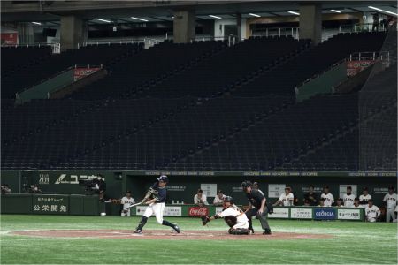 일본 프로야구가 선수 확진자에 이어 집단 감염 우려까지 코로나19의 직격탄을 맞으면서 세 번째로 개막이 연기될 가능성이 높아졌다. 사진은 텅빈 관중석에서 펼쳐지는 도쿄돔의 시범 경기 모습.(사진=연합뉴스)