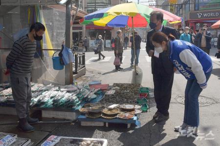 제21대 국회의원선거에서 강서갑에 출마하는 더불어민주당 강선우 후보가 3일 서울 강서구 송화벽화시장에서 '라떼는! 유세단'의 원혜영 의원과 함께 소중한 한 표를 호소하고 있다.