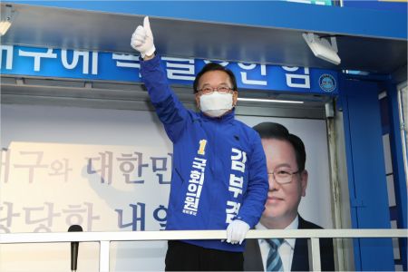 총선 유세 시작 첫날인 2일 오전 대구시 수성구 범어네거리에서 수성갑에 출마한 더불어민주당 김부겸 후보가 지지를 호소하고 있다. (사진=연합뉴스)