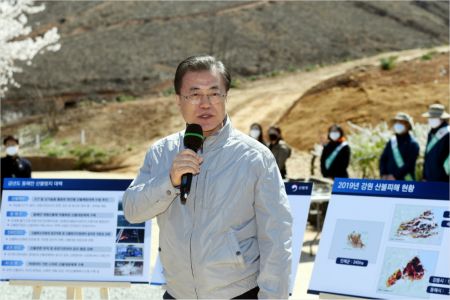 1년 전인 지난해 4월 4일 강원도를 할퀸 대형 산불로 많은 산림이 소실됐지만, 긴급 복구와 조림 계획을 통해 전세계가 부러워하는 산림 강국을 다시 만들어야 한다고 주문하기도 했다.