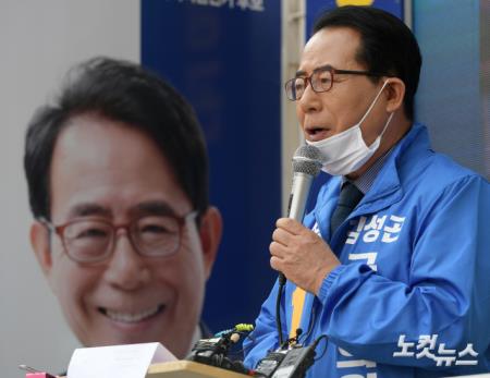 제21대 총선에서 강남갑에 출마한 더불어민주당 김성곤 후보가 7일 서울 역삼동 도곡시장에서 선거유세를 하고 있다.