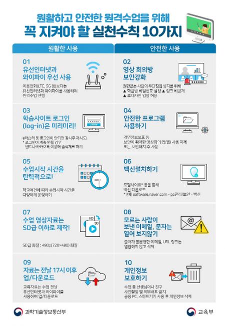 해당 수칙은 각 교육청 홈페이지와 EBS온라인클래스, e-학습터 등 원격 교육 사이트, 한국인터넷진흥원(KISA)의 보호나라 홈페이지 등에서 확인할 수 있다.