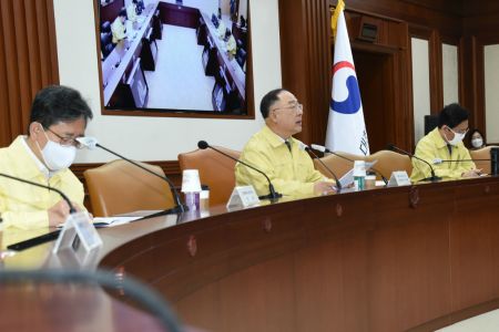 홍남기(가운데) 경제부총리 겸 기획재정부 장관이 9일 정부서울청사에서 열린 '제14차 코로나19 대응 경제관계장관회의 겸 제4차 위기관리대책회의'를 주재하고 있다(사진=기재부 제공)