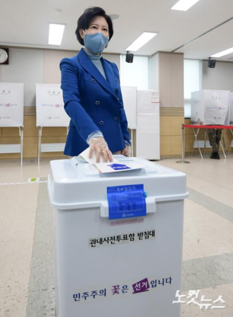 동작구을에 출마한 더불어민주당 이수진 후보가 4.15 총선 사전투표일인 10일 오전 서울 동작구 흑성동 주민센터에서 사전투표을 하고 있다.