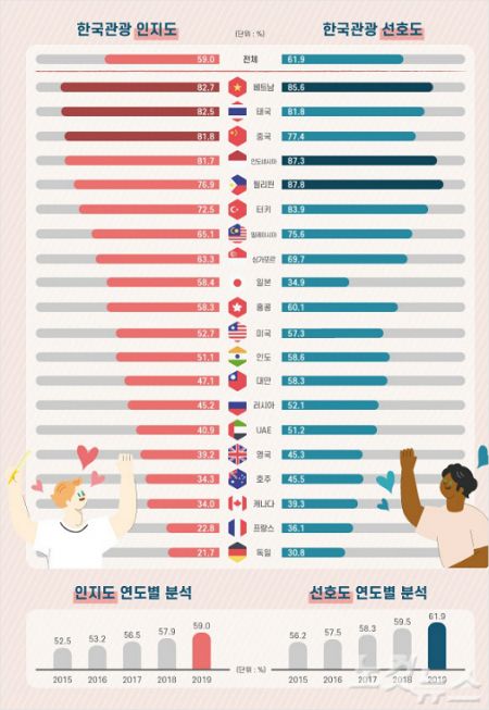 조사결과 인지도는 전년도 57.9% 대비 1.1%포인트 상승한 59.0%을 기록했고, 선호도 또한 59.5% 대비 2.4%포인트 상승한 61.9%를 기록했다. 2014년 이후 6년 연속으로 인지도와 선호도가 상승한 배경에는 방탄소년단 등 K팝(K-pop)의 인기에 힘입은 한류 등 한국 대중문화의 정착과 더불어, 해외 밀레니얼세대 등 젊은 관광 소비층의 트렌드를 반영한 관광공사의 디지털 홍보 노력이 주효했던 것으로 보인다고 관광공사는 분석했다.