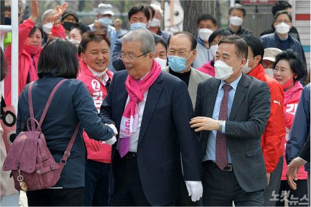 미래통합당 김종인 총괄 선거대책위원장이 지난 10일 경기 고양시 주엽역 앞에서 경기 고양시정 김현아, 경기 고양시병 김영환 후보에 대한 지원유세를 마친 뒤 시민들과 인사하는 모습.(사진=박종민 기자)