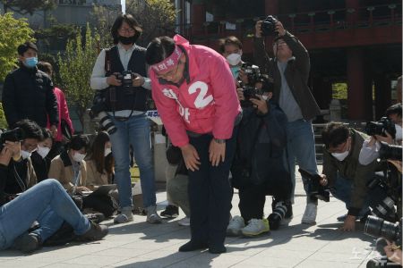 제21대 국회의원 선거를 하루 앞둔 14일 서울 종로 국회의원 후보로 출마한 미래통합당 황교안 대표가 서울 보신각 앞에서 대국민 기자회견을 마치며 국민에게 큰절을 하고 있다. (사진=이한형 기자)