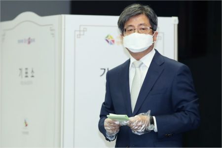 김명수 대법원장이 제21대 국회의원 선거 투표일인 15일 오전 서울 용산구 중부기술교육원에 마련된 한남동 제3투표소에서 한표를 행사 한 뒤 기표소를 나오고 있다. (사진=연합뉴스)