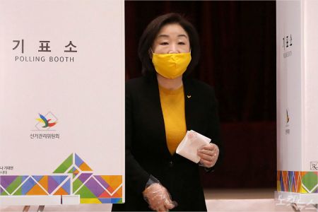 제21대 국회의원선거 경기 고양갑에 출마한 정의당 심상정 후보가 10일 오전 경기도 고양시 덕양구청에 마련된 화정1동 사전투표소에서 한 표를 행사하고 있다. (사진=박종민 기자/자료사진)
