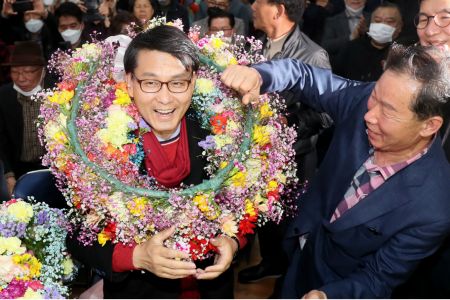 제21대 총선 인천 서구갑 더불어민주당 김교흥 후보(가운데)가 15일 자신의 선거사무소에서 당선이 확실시된다는 개표방송을 본 뒤 지지자와 기쁨을 나누고 있다. (사진=연합뉴스)