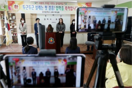 전국에 2차 온라인 개학이 시행된 16일 오후 인천시 강화군 강서중학교에서 열린 '온라인 입학·개학식'에서 교사들이 카메라를 통해 학생들과 첫인사를 하고 있다. (사진=연합뉴스)