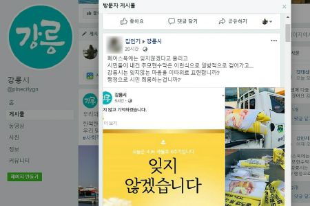 이에 시민들은 개개인 소셜네트워크(SNS) 등으로 관련 소식을 전하며 분노를 공유했다. 시민 김인기(48.중앙동)씨는 지난 16일 오후 7시 20분쯤 강릉시가 운영하는 공식 페이지를 찾았다. 그리고 추모글에 현수막 철거 사진을 첨부하고 "이게 잊지 않겠다는 태도냐"는 항의 댓글을 달았다.