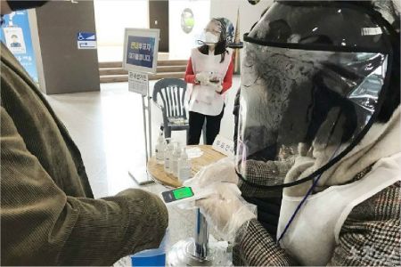지난 10일 대전시청 1층에 마련된 사전투표소 앞에서 선관위 관계자가 발열 체크를 하고 있다.(사진=자료사진)
