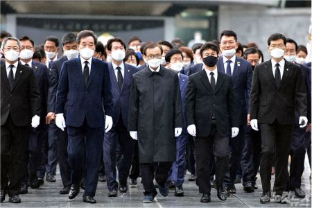 더불어민주당 이해찬 대표와 이낙연 상임선대위원장, 더불어시민당 최배근 공동상임선대위원장 등이 17일 오전 서울 동작구 국립서울현충원을 찾아 참배를 마치고 이동하고 있다. 윤창원기자