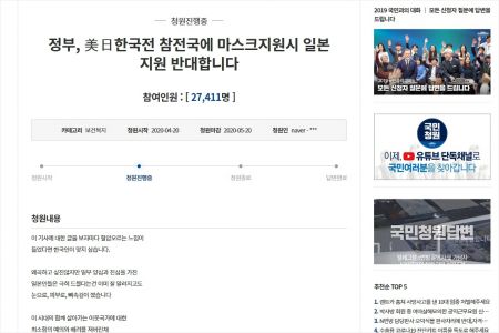 이후 몇 시간 뒤 청와대 국민청원 게시판에는 '정부, 美日한국전 참전국에 마스크지원시 일본 지원 반대합니다'라는 제목의 청원글이 올라왔다.