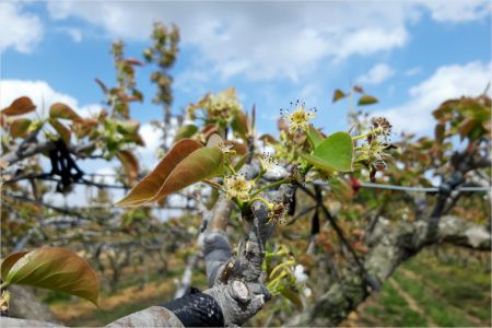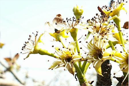 전남 나주 한 밭에서 자라고 있는 배나무에 핀 꽃이 냉해 피해를 입어 검은색으로 변했다(사진=전라남도 제공)