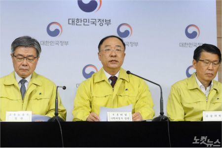홍남기 부총리 겸 기획재정부 장관(가운데)이 22일 오후 정부서울청사 브리핑룸에서 '제5차 비상경제대책회의' 내용에 대해 브리핑을 하고 있다. 왼쪽부터 이재갑 고용노동부 장관, 홍 부총리, 은성수 금융위원장. 황진환기자