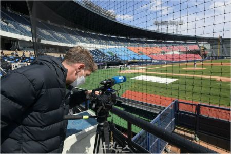 21일 서울 잠실야구장에서 열린 KBO리그 무관중 연습경기 두산 대 LG 경기에서 외신기자가 취재를 하고 있다. 한국 프로야구 정규 시즌은 다음 달 5일 어린이날 '무관중' 경기로 개막한다.이한형 기자