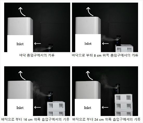 이 실험에서는 바닥으로부터 각각 8㎝, 16㎝, 24㎝ 등의 높이에서 인공적으로 비말을 발생시킨 후 공기청정기를 작동시켰을 때 비말의 이동 방향을 관찰했다. 이 결과, 가습기 배출구와 가장 가까운 24㎝ 높이에서 생긴 비말이 배출구 쪽으로의 이동성이 가장 강한 것으로 나타났다.