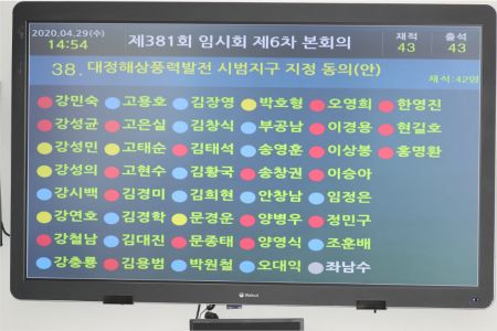 제주도의회는 29일 오후 제381회 임시회 제6차 본회의에서 '대정해상풍력발전 시범지구 지정 동의안'을 표결에 부친 결과 재석 의원 42명 가운데 찬성 16명, 반대 20명, 기권 6명으로 부결했다.