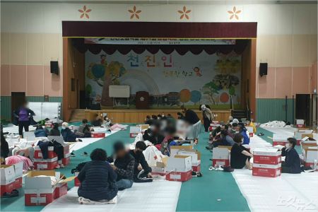 지난 1일 오후 발생한 산불이 확산하면서 인근 학교에 대피한 주민들. (사진=전영래 기자)
