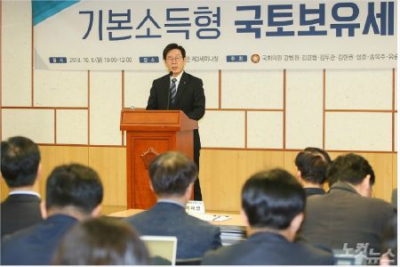 이재명 경기도지사가 2018년 10월 국회에서 열린 기본소득형 국토보유세 토론회에 참석해 축사를 하고 있다. (사진=경기도 제공)