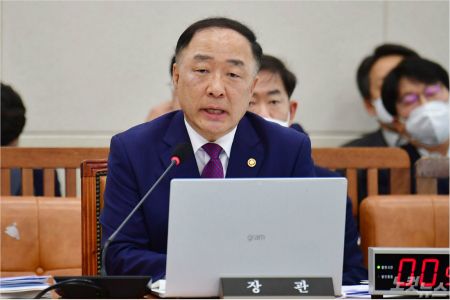 홍남기 경제부총리 겸 기획재정부 장관이 28일 국회에서 열린 기획재정위원회 전체회의에서 의원 질의를 받고 있다. 윤창원기자