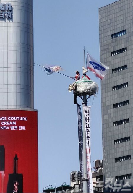 삼성 해고노동자 김용희(61)씨가 6일 오후 서울 강남역 사거리 철탑에서 농성 중이다. (사진 = 김태헌 기자)