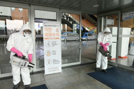 코로나19 예방을 위해 킨텍스 출입구에서 방역작업을 진행 중인 킨텍스 관계자들. (사진=킨텍스 제공)