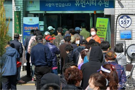 경기도 재난기본소득 방문 신청이 시작된 가운데 지난 4월 21일 경기도 수원시 세류3동 행정복지센터에서 신청자들이 대기하고 있다. 박종민기자