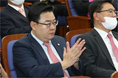 미래통합당 김성원 원내수석부대표가 4월 28일 서울 여의도 국회에서 열린 총회에서 인사말을 들으며 박수치고 있다. (사진=연합뉴스)