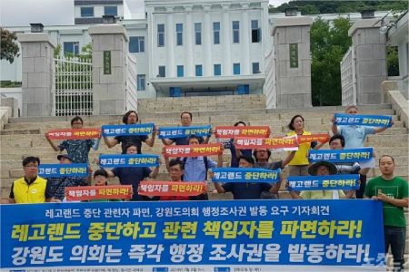 2020년 5월 19일 춘천 레고랜드 사업 반대 활동을 진행하고 있는 시민단체들이 강원도의원들에게 레고랜드 사업 예산 동의에 따른 책임을 요구하고 나섰다. 춘천 레고랜드 중단촉구 범시민대책위원회는 이날 강원도의회 앞에서 집회를 열고 291회 임시회 2차 본회의에 참가하는 도의원들에게 각서에 서명을 요구했다. 각서에는 "레고랜드 사업에 문제가 발생해 법적, 금전적 문제가 발생할 경우 강원도의원으로서 모든 책임을 다하고, 특히 모든 사업과 예산이 강원도 의회에서 통과된만큼 정치적 책임과 금전적 책임, 법적 책임까지 다하겠다"는 내용을 명시했다.